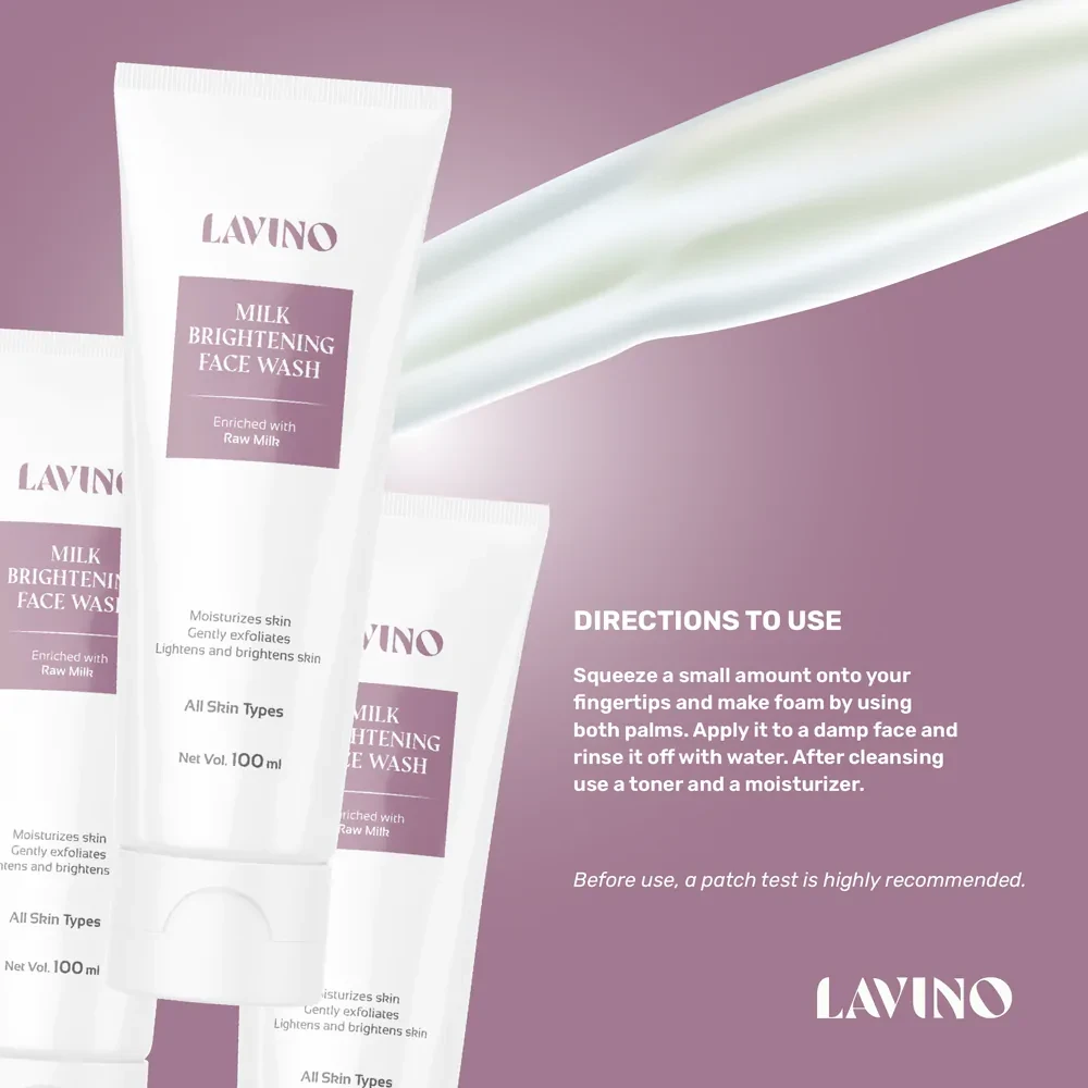 Ultra-soothing and super nourishing Lavino Milk Brightening Face Wash deeply cleanses dirt from the skin. It consists of milk. Milk contains lactic acid, a natural and mild exfoliator that helps to remove dead skin cells to make spotless, moisturized, and brighter-looking skin.
