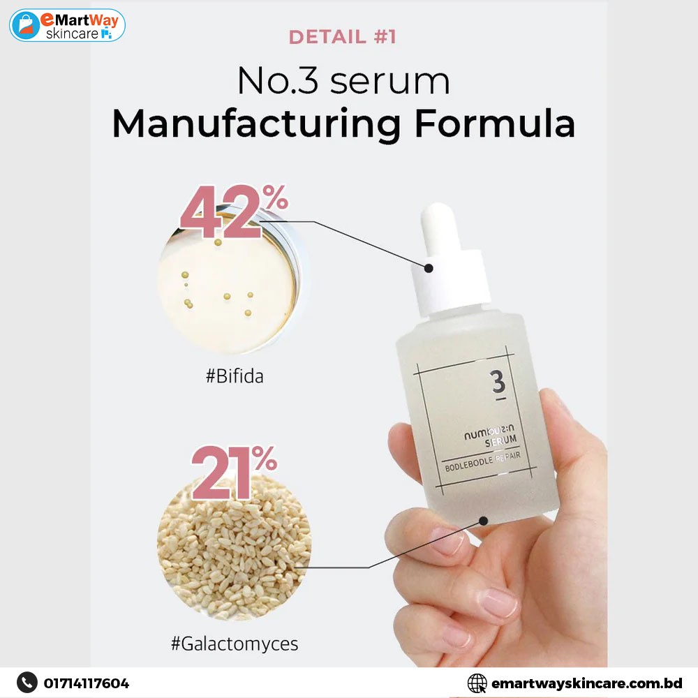 Numbuzin No.3 Skin Softening serum has an impressive list of ingredients, with two popular fermented ingredients doing the bulk of the heavy lifting - Bifida Ferment Lysate and Galactomyces Ferment Filtrate. The use of fermented ingredients in skincare has become increasingly popular in recent years. The ingredients are packed with all of the good things, as the process of fermentation naturally produces vitamins, amino acids and antioxidants. It also breaks down molecules, making them smaller and easier for the skin to absorb.