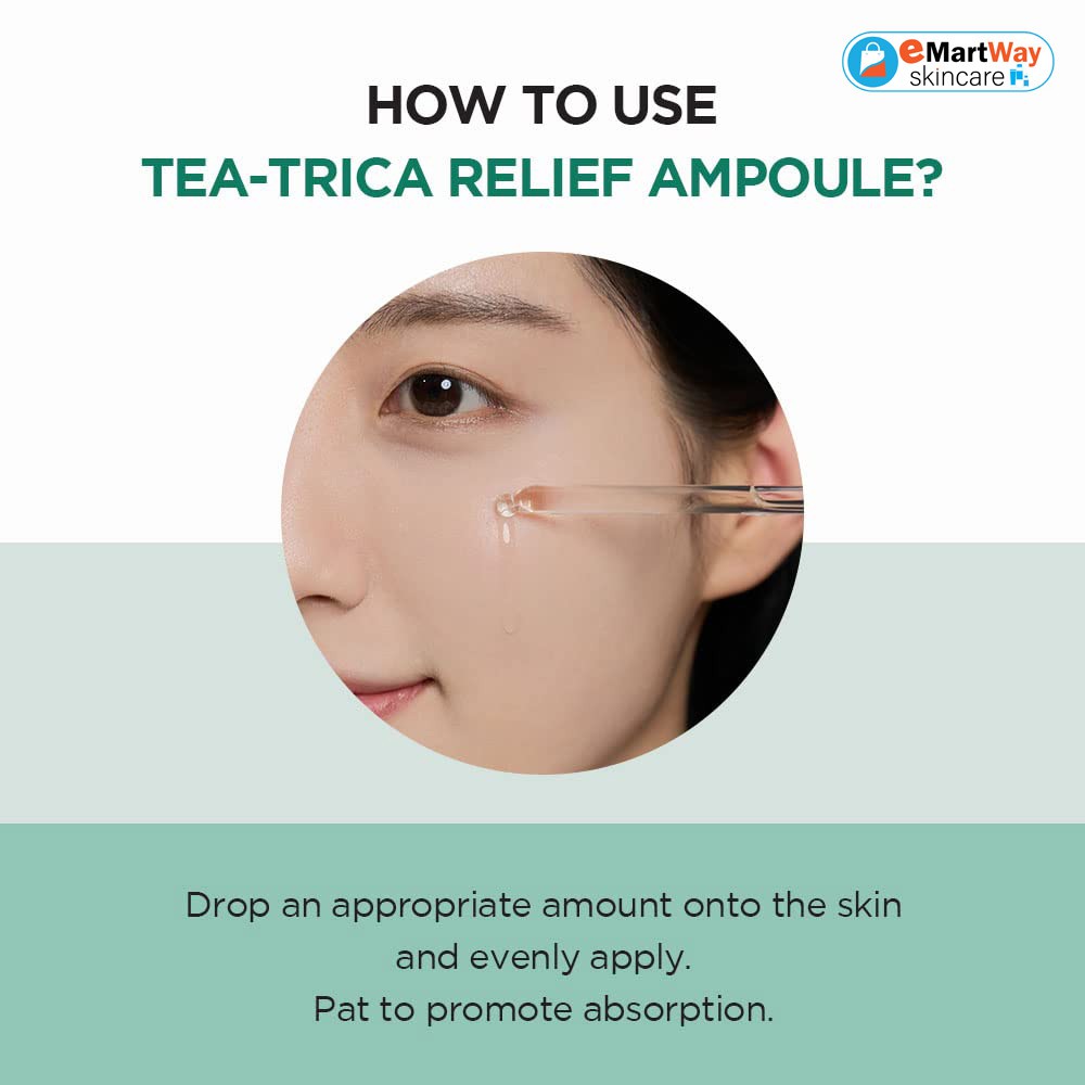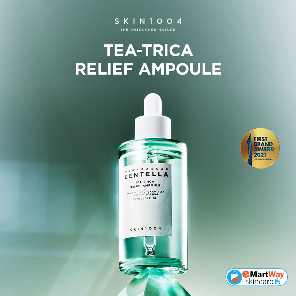 SKIN 1004 Madagascar Centella Tea-Trica Relief Ampoule A non-comedogenic ampoule with Tea tree, Pine tree, and Cypress that helps care for blemish-prone skin and maintain a healthy-looking complexion Pine Tree Complex helps care for acne-prone skin and maintain a balanced appearance Centella Asiatica Extracts help calm sensitive skin and support the skin’s natural protective function Anti-Sebum P Complex controls excess sebum, oil and tightens pores Non-comedogenic test complete for safe use of sensitvie acne-prone skin.