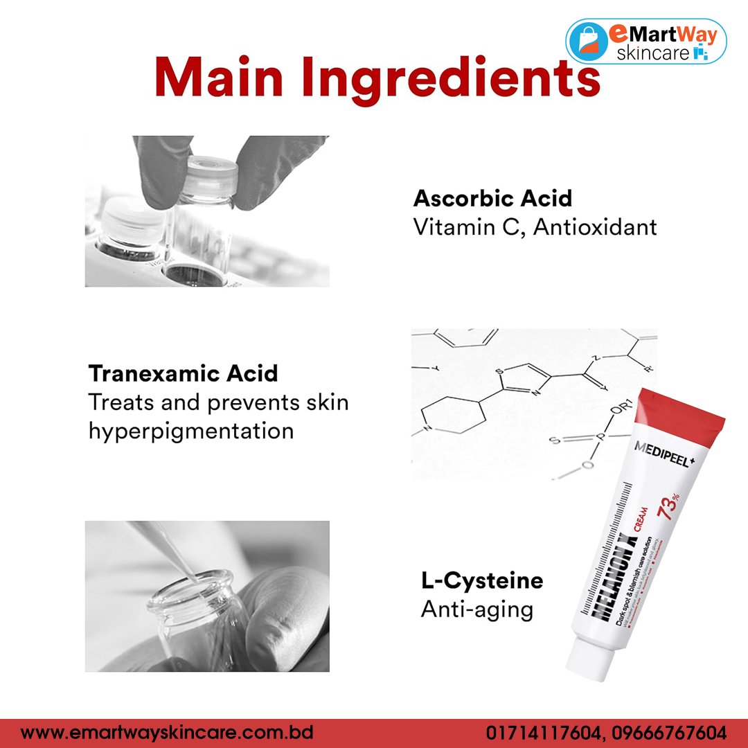 The highly concentrated Tranexamic acid, Magnesium Ascorbyl Phosphate and Ascorbic Acid, which are SIC level research paper published ingredients, take care of outside freckles caused by hyperpigmented melanin and inside freckles that are hidden at the same time.The patented brightening ingredients and complex help to treat melanin and make skin strong to melanin. The nature-derived ingredient extracts retain moisture and make skin texture moist.