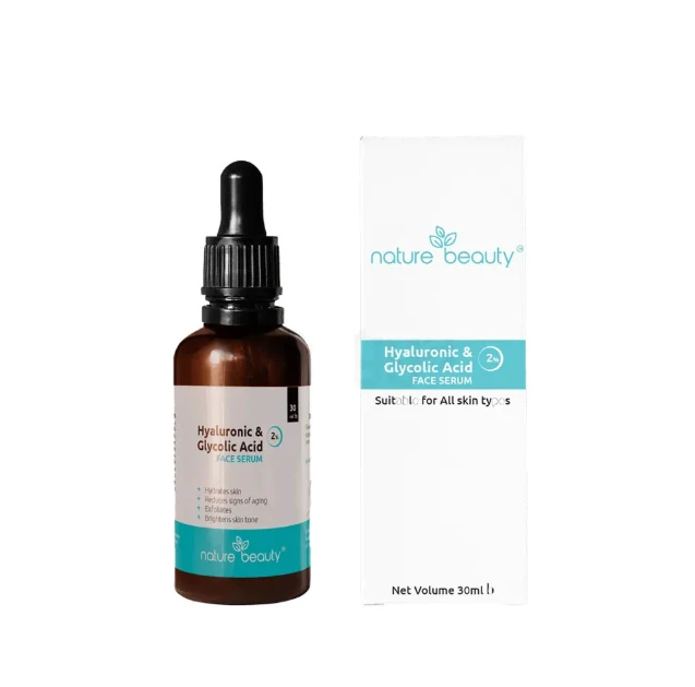 Nature Beauty Hyaluronic 1% & Glycolic Acid 2% Face Serum a powerful combination that gently restrains moisture in the skin, removes dead skin cells, revealing a brighter, smoother complexion. It helps reduce the appearance of fine lines, wrinkles, and blemishes, while also unclogging pores and enhancing the absorption of other skincare products. Radiate confidence with healthy and bouncy skin.