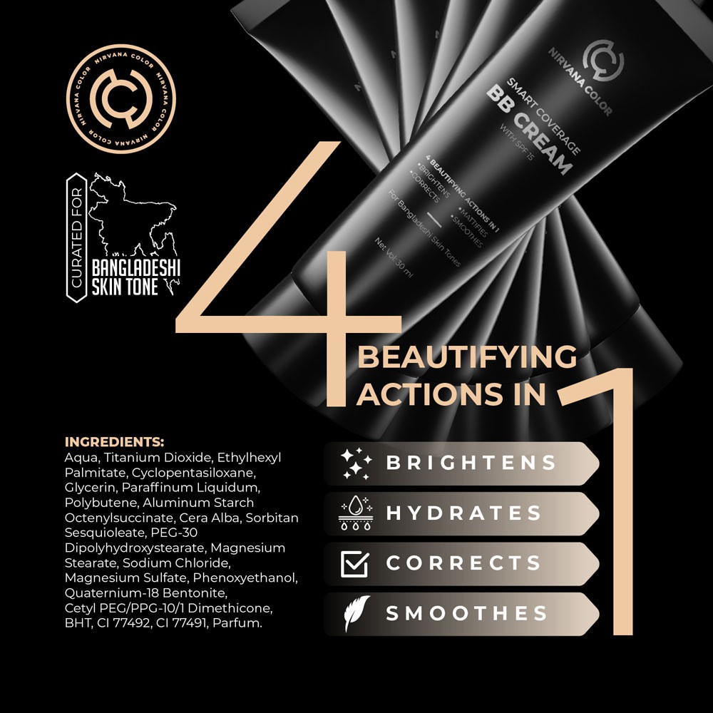 Accentuate your beauty with the NIRVANA COLOR SMART COVERAGE BB CREAM WITH SPF 15. It is a lightweight, matte, and skin-perfecting bb cream made for Bangladeshi beauties. This bb cream is ideal for your everyday makeup look.