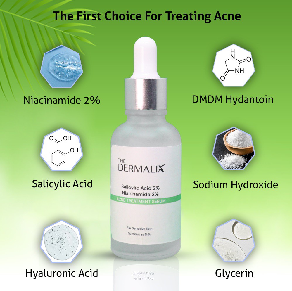 The Dermalix Salicylic Acid 2% + Niacinamide 2% Acne Treatment Serum is a multitasking formulation that treats acne, unclogs pores, and prevents skin damage. The combination of 2% Salicylic Acid & Witch Niacinamide 2% exfoliates the pores' walls to prevent the appearance of whiteheads and blackheads. With no more sebum in the pores, it eventually stops the formation of acne. When your pimples say hi, give them the best farewell with this super acne treatment serum! Bring on the best of the filter-free YOU with your spotless, unique & youthful skin. Barcode 8801030802235